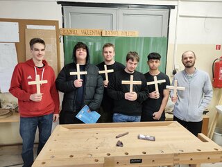 Tesne pred Veľkou nocou sa vyučovanie katolíckej náboženskej výchovy v triede I.FT nieslo v netradičnom duchu. Žiaci troch učebných odborov opustili školské lavice a presunuli sa do dielne ručného obrábania dreva, kde dostali priestor spojiť vieru, symboliku a remeselnú prácu. Každý žiak si vlastnoručne vyrobil drevený kríž. Pri ručnom opracovaní dreva si študenti osvojovali trpezlivosť, presnosť a cit k prírodnému materiálu, zároveň mali možnosť hlbšie sa zamyslieť nad významom kríža v predveľkonočnom období. Výsledkom neboli len hotové výrobky, ale aj netradičný zážitok, ktorý spájal duchovný rozmer s praktickými zručnosťami.
